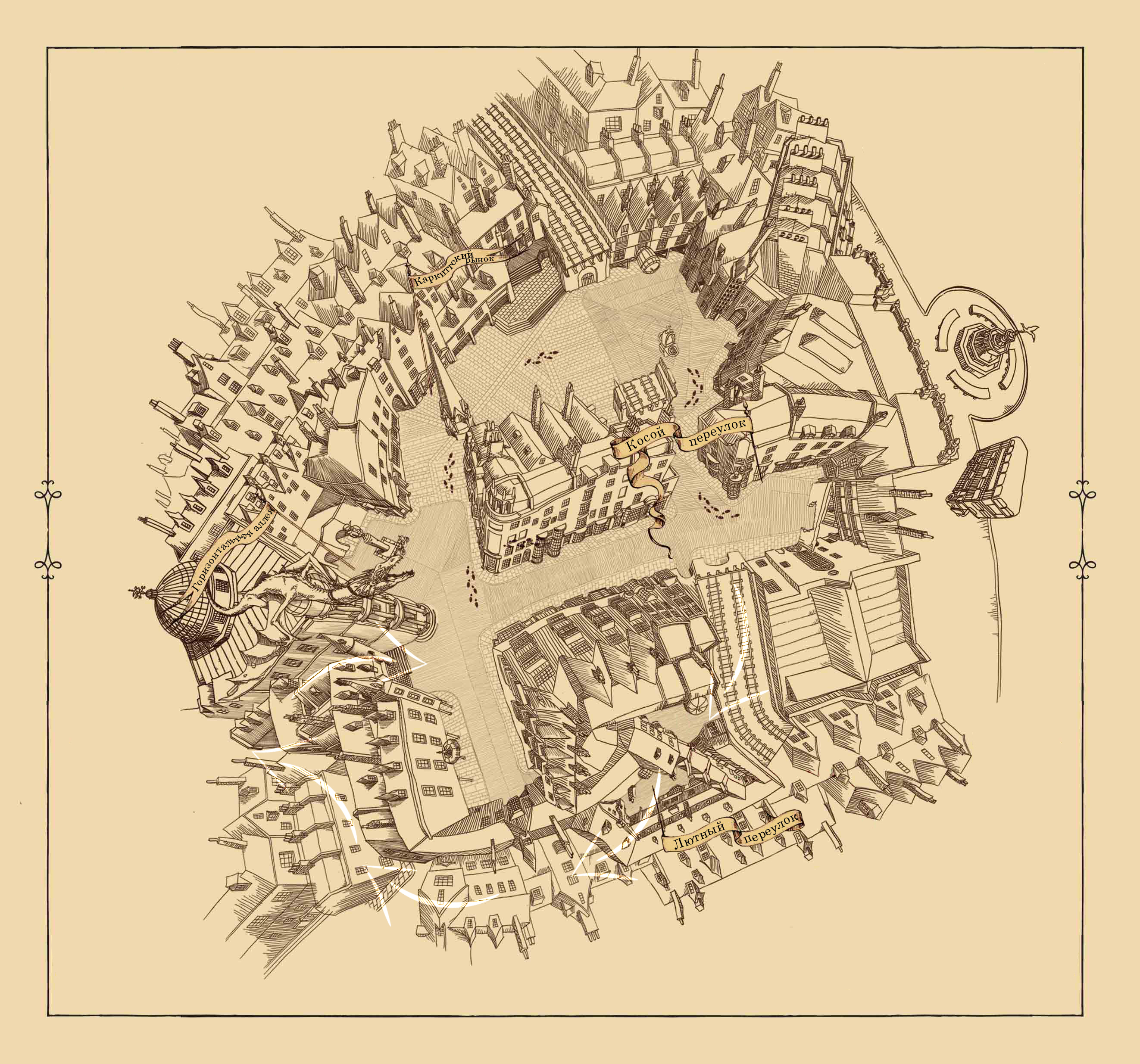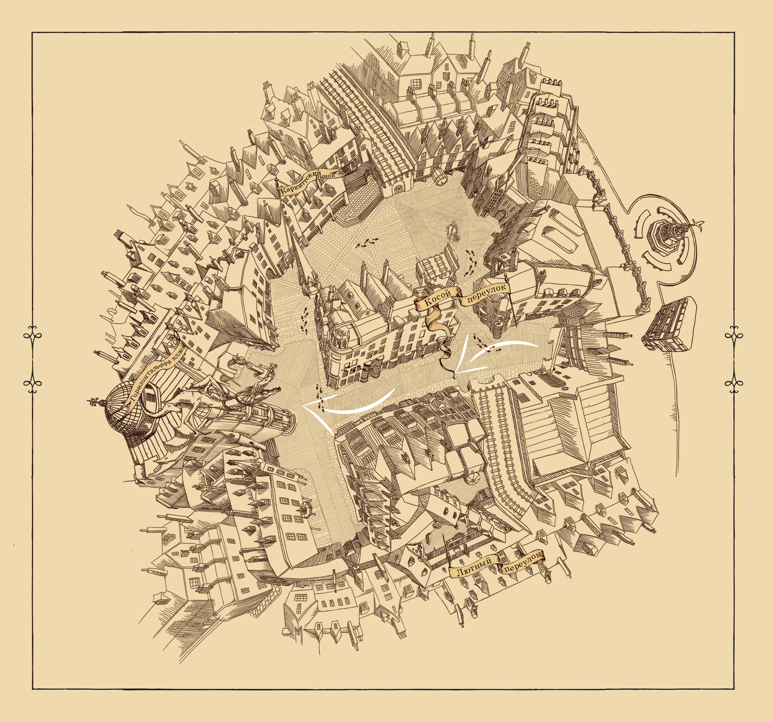 *увеличение по клику[/float]Лютный переулок был образован стихийно на свободных зачарованных территориях, изначально предусмотренных под расширяющийся центр магической торговли в Лондоне. Волшебники-предприниматели, не обладающие достаточными средствами, чтобы открыть магазин в Косом переулке или не получившие на это разрешения, изначально ставили палатки в темном ответвлении – от входа в Косой переулок налево в арку – где осуществляли незаконную торговлю, о которой вроде бы все знали, но закрывали на это глаза. Палатки росли и ширились, превращаясь в крошечные темные магазины, а другие - исчезали без следа. Никто не заявлял о пропаже, никого не привлекали к ответственности, но всем детям и подросткам вскоре запретили заходить в темную арку слева у входа в Косой переулок, являющуюся и по сей день основным входом в переулок, или спускаться по узкой лестнице слева от величественного банка Гринготтс, куда ведет указатель «Лютный переулок».
